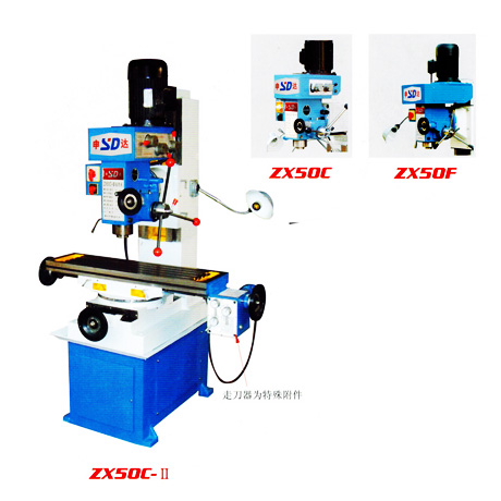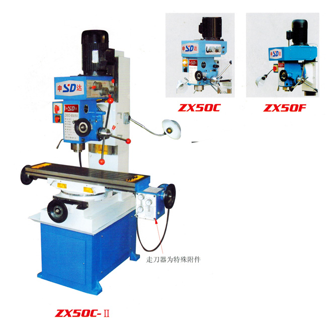 ZX50C钻铣床为多功能钻铣床,立铣为齿轮转动。装有机械进给器,可实现工作台纵向自动进给,减少了劳动强度,提高了加工精度和表面光洁度。床身导轨经淬火处理,有良好的耐磨能力。铣头安装于滑臂前端,可上下移动,不仅能在垂直平面内左右回转动45°,又可在床身上回转360°,具有良好的加工万向性。在 ZX50C钻铣床 安装相应附件,可进行立铣、卧铣、钻、镗、扩等多种加工,可加工平面、沟槽、螺旋面、斜面、成型面以及花键、齿轮等。